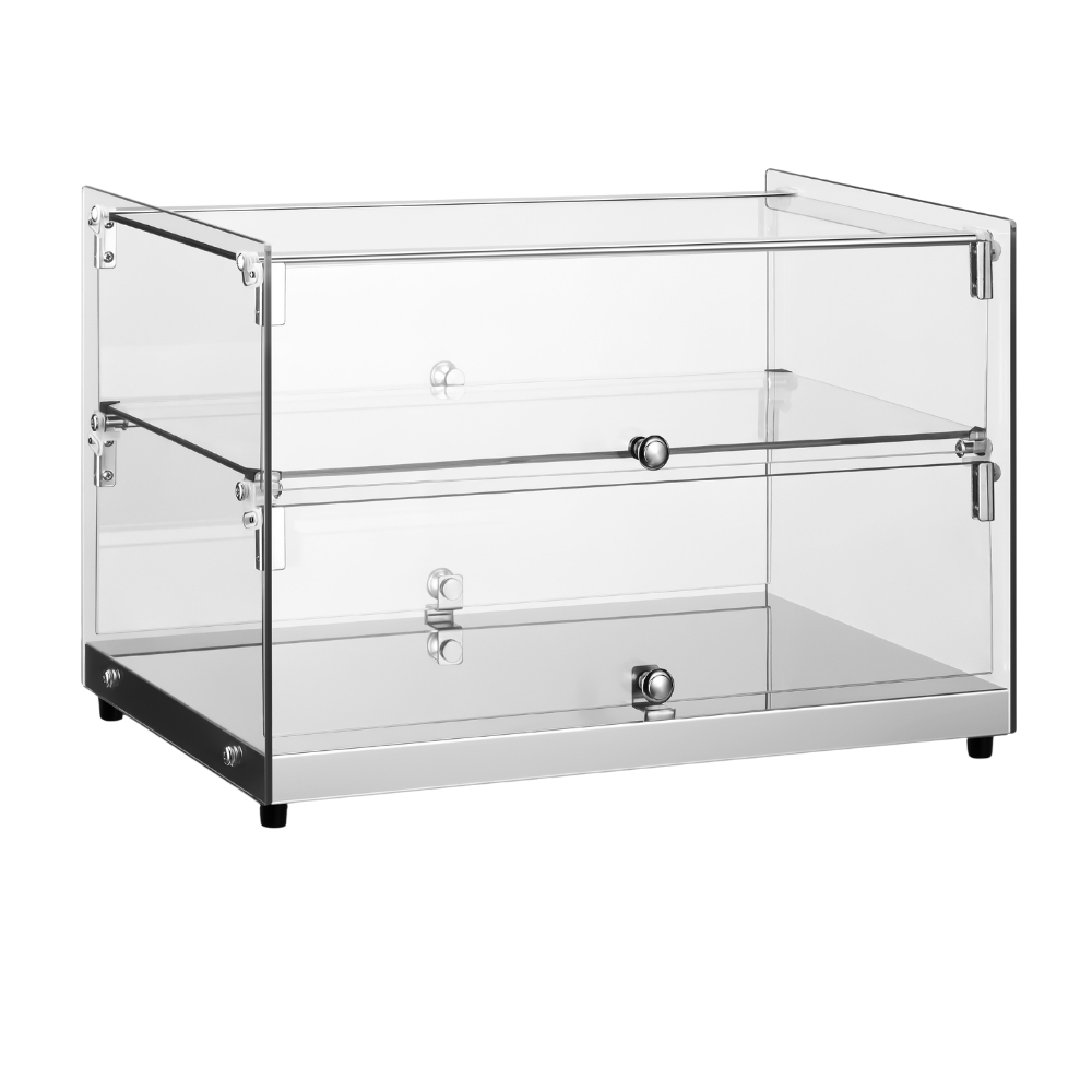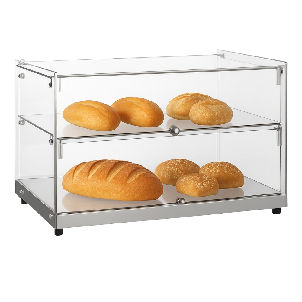 Βιτρίνα τροφίμων από ασφαλές γυαλί για ιδανική προβολή γλυκών, αρτοσκευασμάτων και σνακ σε επαγγελματικούς χώρους εστίασης. Η διάφανη κατασκευή της προσφέρει πανοραμική θέαση των προϊόντων από κάθε γωνία, προσελκύοντας τους πελάτες και διατηρώντας τη φρέσκια τους εμφάνιση. Σχεδιασμένη για μέγιστη ευελιξία στη διάταξη του καταστήματος, εξασφαλίζει ορατότητα από όλες τις πλευρές. Στιβαρή, επαγγελματική κατασκευή με βάση από ανοξείδωτο ατσάλι, ασφαλείς λαβές και σφραγισμένες γυάλινες πόρτες για υγιεινό περιβάλλον. Το εσωτερικό της καθαρίζεται εύκολα. Μια πρακτική και κομψή λύση για κάθε επιχείρηση.