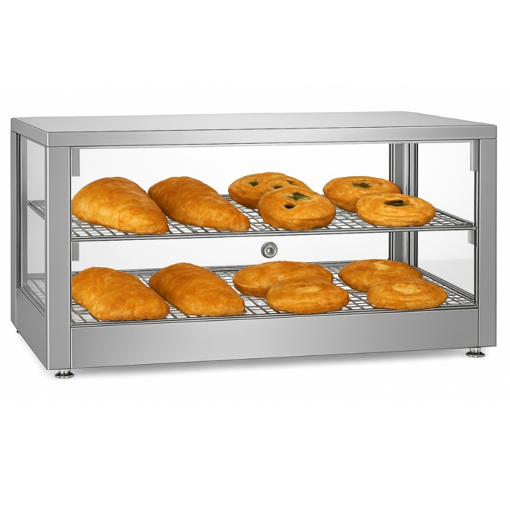 Θερμαινόμενη επιτραπέζια βιτρίνα που διατηρεί αρτοσκευάσματα, πίτσες και άλλα ζεστά σνακ στην ιδανική θερμοκρασία σερβιρίσματος. Διαθέτει ανθεκτικό περίβλημα από ανοξείδωτο ατσάλι για αντοχή και εύκολο καθαρισμό, προσφέροντας παράλληλα μέγιστη ορατότητα των τροφίμων. Διαθέτει ρυθμιζόμενο θερμοστάτη ακριβείας για την ρύθμιση του κατάλληλου επιπέδου θερμότητας. Στο εσωτερικό, τα σταθερά επιχρωμιωμένα ράφια παρέχουν στιβαρή στήριξη και ελκυστική παρουσίαση. Ιδανική λύση για αρτοποιεία και κυλικεία, συνδυάζει τη στιβαρή κατασκευή με τη λειτουργικότητα για την υγιεινή και αποτελεσματική προβολή των τροφίμων.