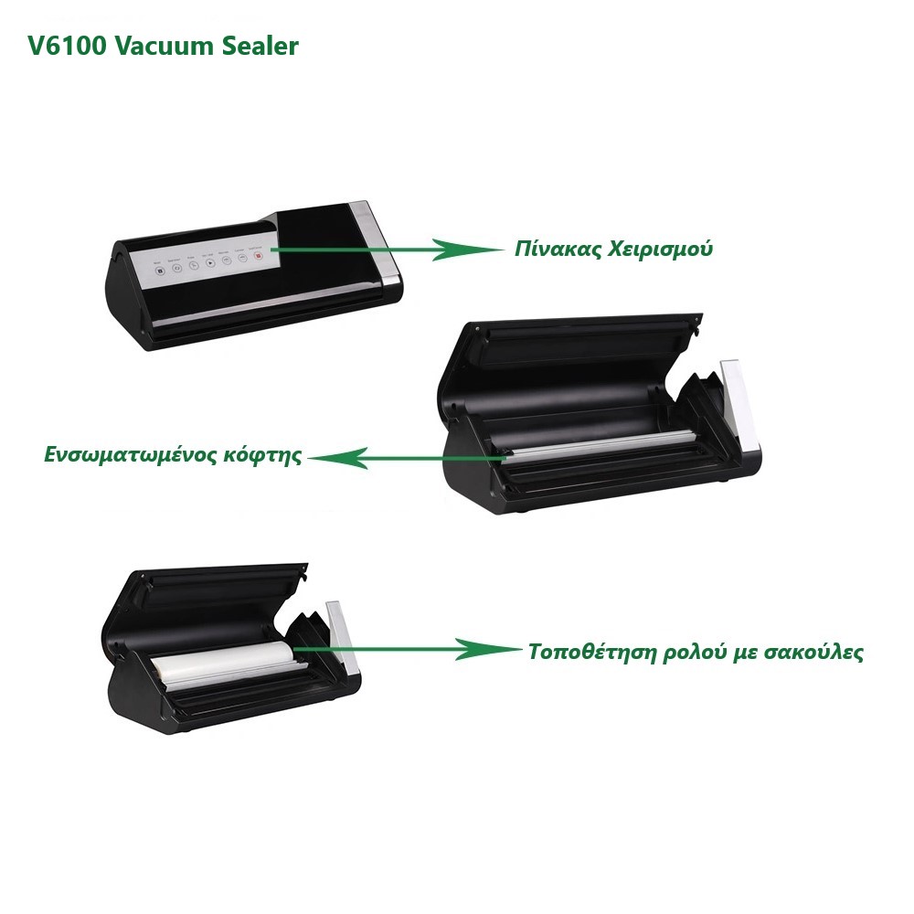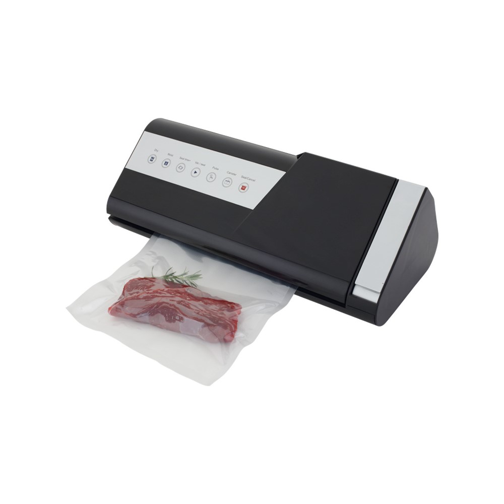 Vacuum κενού αέρος ιδανικό για τρόφιμα, λαχανικά, φρούτα, ψάρια, κρέας, σνακ, ρύζι, αλεύρι και υγρά υλικά. Ηλεκτρικό με ημιαυτόματη λειτουργία. Παρατείνει την διάρκεια ζωής των τροφίμων x 5 φορές περισσότερο από τις συμβατικές μεθόδους αποθήκευσης και διατηρεί την φρεσκάδα αφαιρώντας τον αέρα που θα προκαλούσε αλλοίωση. Συμπληρώνει τις μεθόδους μαγειρέματος Sous Vide. Ενσωματωμένη αποθήκευση ρολού και ενσωματωμένος κόφτης. Αφαιρούμενο κουτί αποθήκευσης υγρών που συλλαμβάνει τα υγρά υπερχείλισης. Διαθέτει μοναδικό σύστημα Easy-Lock και παράταση του χρόνου σφράγισης. Επίσης, έχει ξεχωριστό κουμπί για μαρινάρισμα και τα τρόφιμα μαρινάρονται πολύ γρήγορα, σε λίγα μόλις λεπτά. Πιστοποιήσεις: CE, GS, RoHS, SAA, ETL.